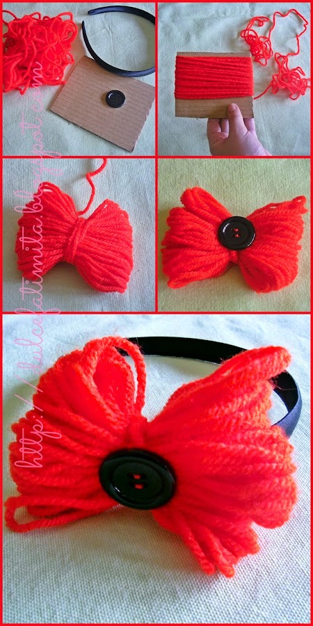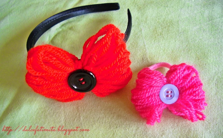 Tengo dos cajas llenas de lana, de todos los colores, y la verdad es que la culpa es mía, porque siempre que pienso en hacer algo de punto, compro el doble de la necesaria "por si acaso", claro, así, no se puede. Así que tengo que darles salida, a la voz de ya, que, entre los retales de tela "por si acaso" y la lana, el despacho ya no da de sí, jejejeje. Y lo mejor de todo, que me sobran pequeños retales de lana, que no me dan para hacer nada completo. Tenía el sobrante de la lana que usé para el bolso que hice de ganchillo hace más de una año dando vueltas por ahí, hasta que el jueves, ordenandolo todo un poco (cuando me estreso me da por ordenar y cambiar muebles de sitio, y ésta semana ha sido un poco dura) Y se me ocurrió hacer un lazo de lana, y "pegarlo" a una diadema...