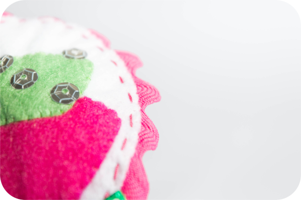 Una vez lo tengamos todo cosemos o pegamos a una de las piezas blancas las piezas verde y rosa imitando a una tarta inclinada tal y como ves en la foto, y como decoración las lentejuelas plateadas a tu antojo. Por último en la parte inferior colocamos el lazo.