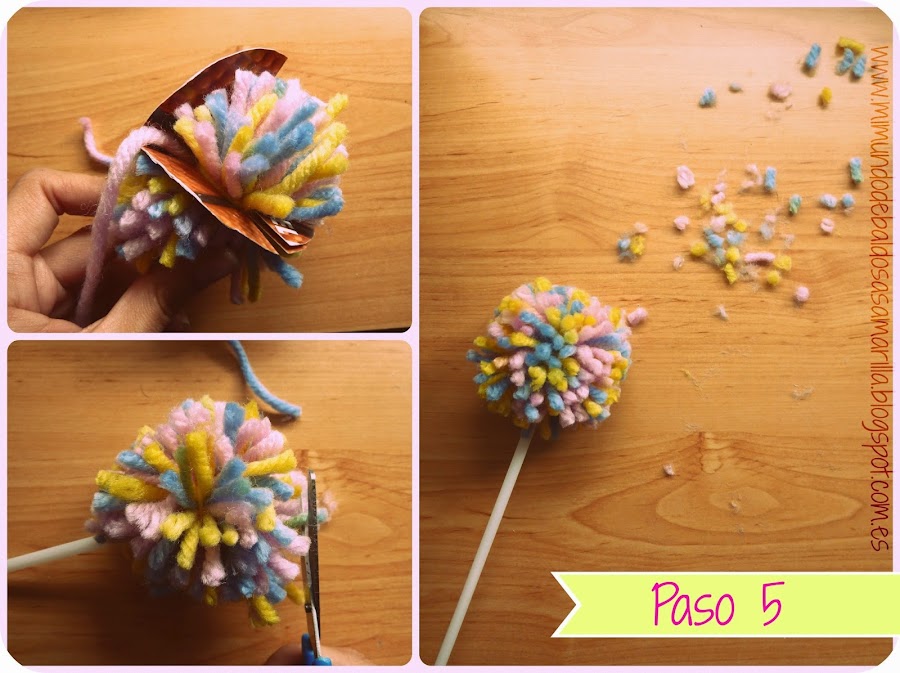 5. Por último, quitamos los moldes y, para que quede más bonita, cortamos los flequitos que hayan quedado más largos para así conseguir una bola más homogénea. Y listo! ya tendremos nuestro diente de león, o flor pompón!