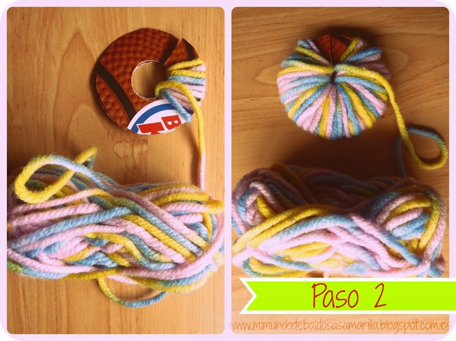 3. Cuando ya esté totalmente forrada (cuanto más lana, más compacto, blandito y gustoso queda el pompón) tenemos que cortar la lana de todo el contorno de la rosca, pasando las tijeras entre los dos moldes, con cuidado de que no se nos escape la lana que habíamos liado con tanto cuidado! ;)