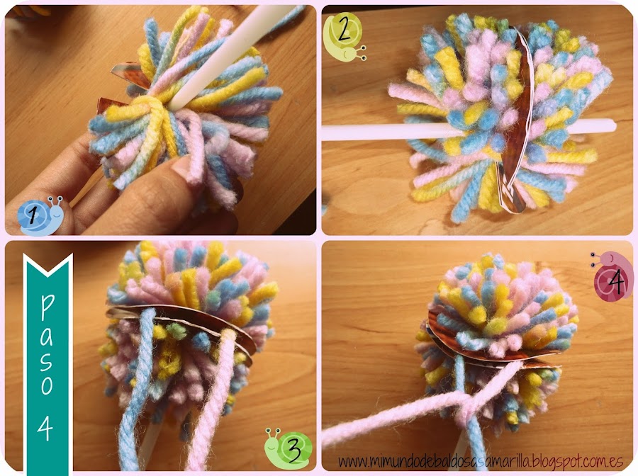 4. Hecho esto, pasamos la ramita por el agujero de la rosca, enrollamo un trozo de la lana entre los dos moldes y anudamos un par de veces fuerte, apretando todo lo que podamos y pillando a la rama con este nudo, para que quede bien fijo tanto el pompón como la rama.