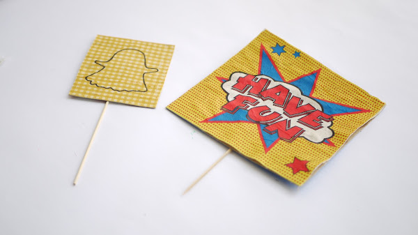 Para completar el tinglado, he aprovechado las servilletas tan chulas de Innspiro para hacer unos carteles que den más aspecto de photobooth. He hecho uno de "have fun" y otro de "snapchat" para que queden aún más claro que los disfraces son filtros de esa aplicación.