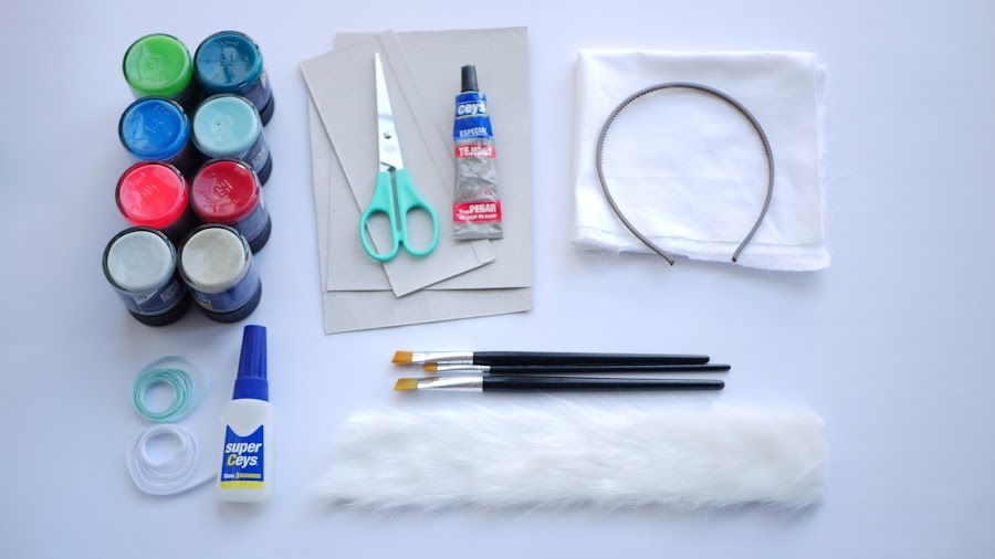 Para este disfraz necesitas: una diadema, pinturas de colores variados (para hacer el arcoiris), pintura de purpurina plateada (para dar ese aspecto mágico de los unicornios), lazo o cuerda, una tira de pelo blanco, cartón, tela blanca, pegamento instantáneo, pegamento textil, tijeras, pincel, un palillo de brocheta, celo y un punzón o similar.