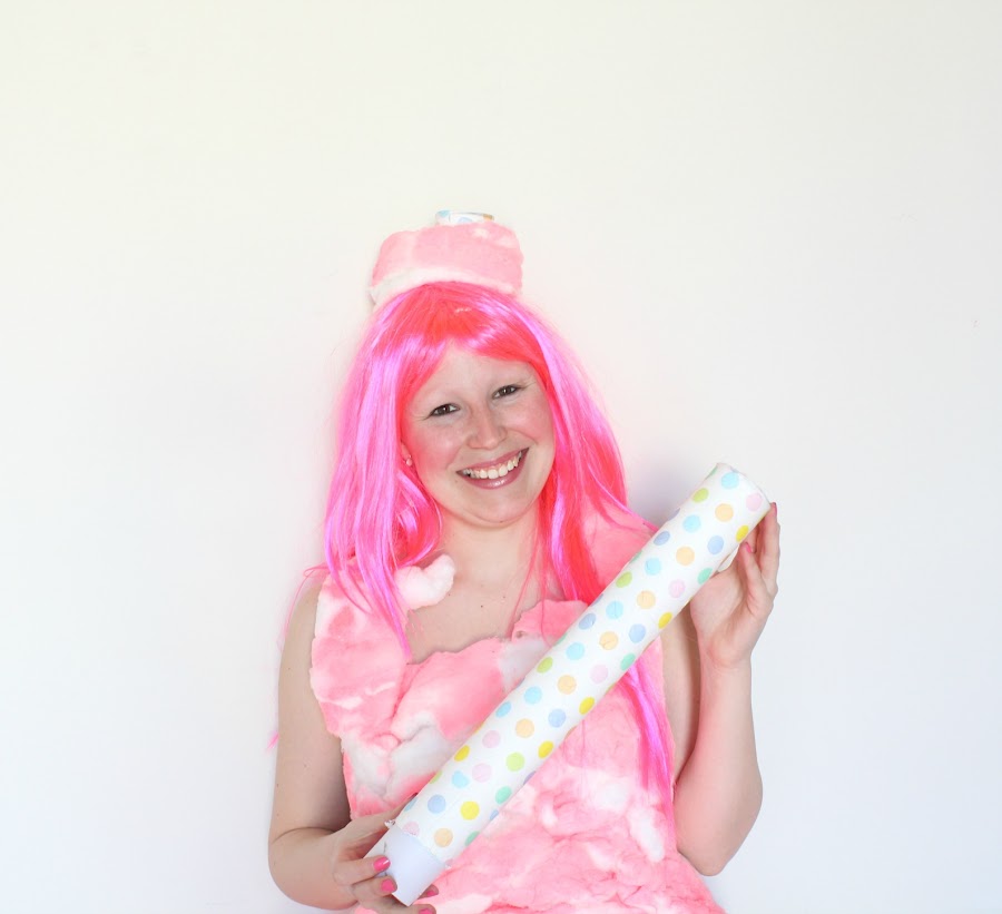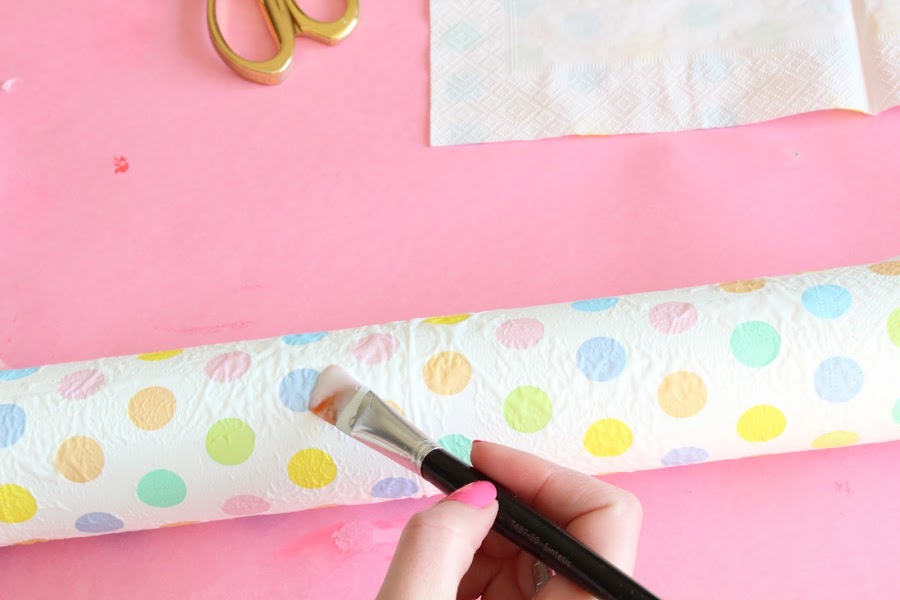 3 Paso: Ahora toca crear el palo del algodón de azúcar, podéis usar rollos de papel de cocina o algún envase en forma cilíndrica. Para que el decoupage quede bonito lo mejor es pintar previamente el cilindro de blanco.