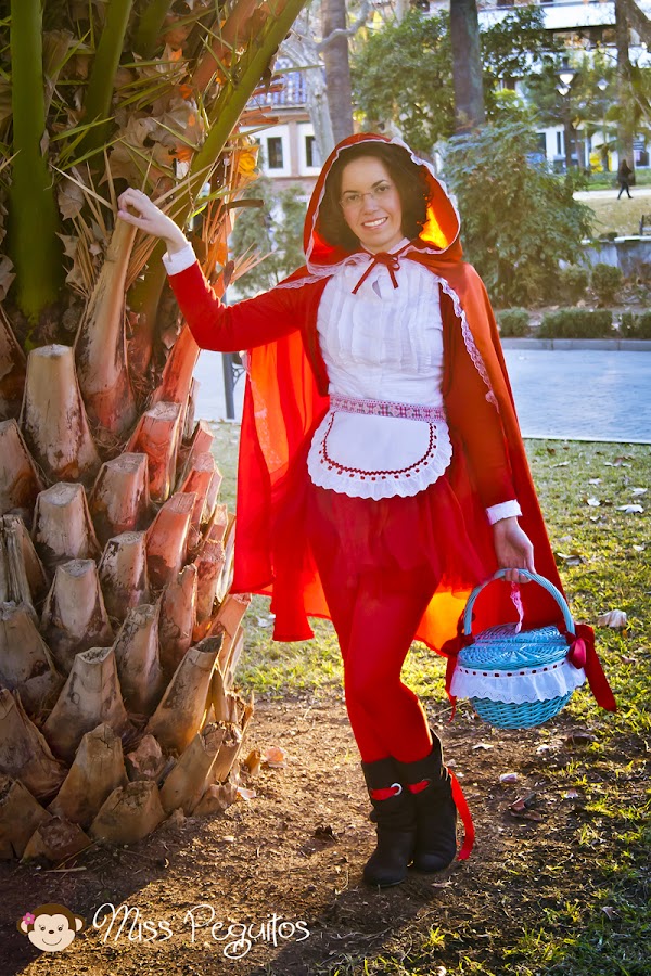 Terminado nuestro lobo el disfraz de caperucita es mucho más sencillo. Una camisa blanca mona que tengas por el armario, rebeca y medias rojas. La faldita de tul es muy sencilla de hacer, es tan solo cortar tiras de tul e irlas anudando con un nudo de golondrina a una gomilla elástica que será lo que usemos de cinturilla, aquí podéis ver un tutorial dónde os lo explican. La parte más "difícil" es el delantalito, pero tan poco es tanto, cortar un trozo de tela, añadirle por el borde puntilla con pasacintas, el cual también usé para decorar la cestita, y para anudarlo a la espalda le cosí un tapapuntos de flores.