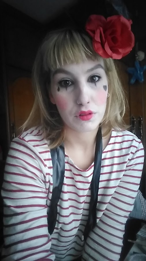 Y ya para el maquillaje algo muy sencillo. Cara blanca, unas lineas en los ojos y algún detallito más, y unos pequeños labios rojos.