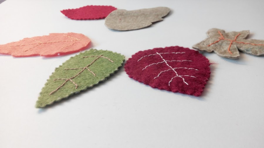 - Una vez recortadas dibuja con puntadas de hilo el tallo interior que tienen las hojas reales.