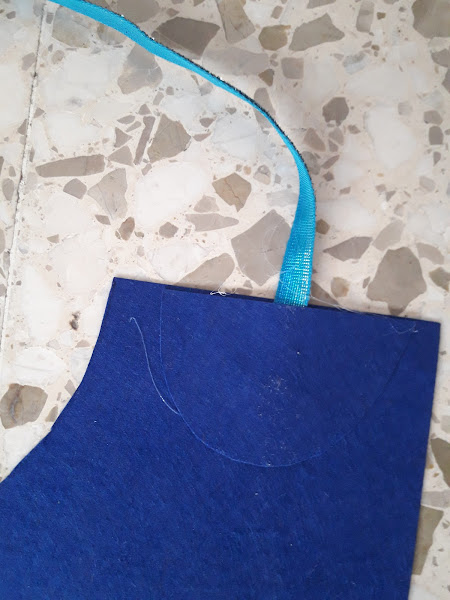 A continuación, procedemos a poner los lazos para sostener la capa alrededor del cuello. Para ello solo hay que recortar medio círculo para hacer una especie de sandwich entre este trozo de tela y el de la capa y que enmedio se sitúe el lazo. Lo pegaremos todo con silicona caliente.