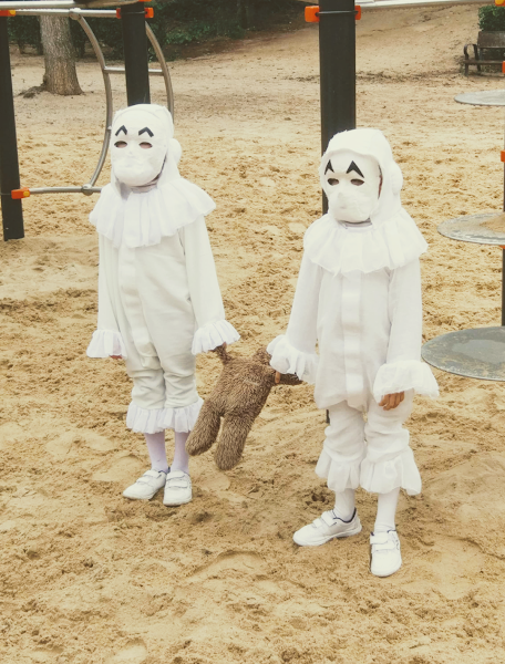 Para confeccionarlo he utilizado tela de gasa, los materiales habituales de costura una mascara blanca que puedes comprar en bazares y un oso de peluche.