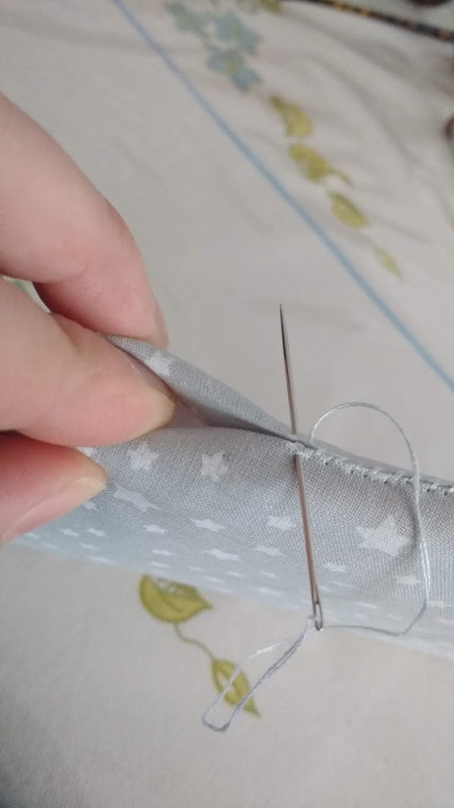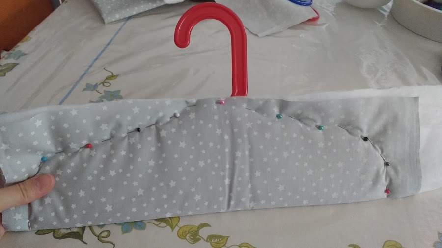 Desharemos un poco el hilván por un lateral y meteremos la tela por la percha de manera que empezamos a coser con puntada escondida el borde de la percha.