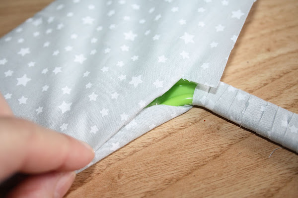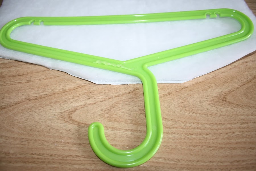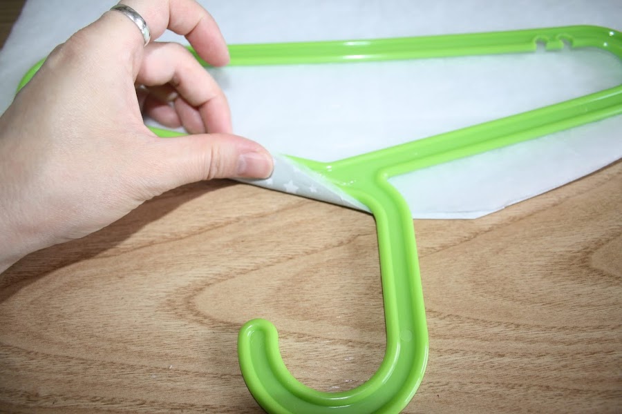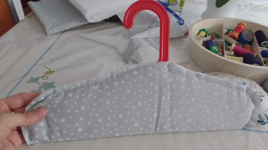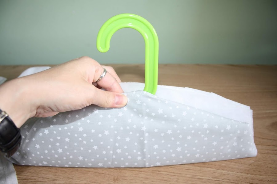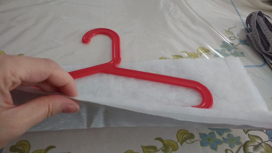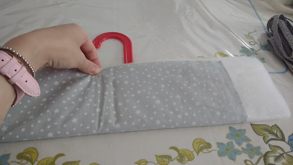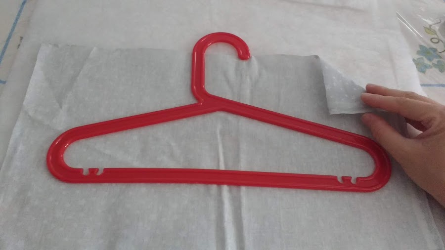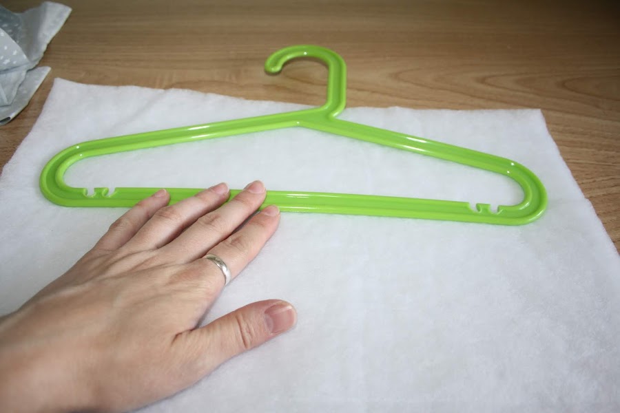 Empezamos colocando la percha sobre la tela de guata y la de algodón. Después doblamos las telas de modo que la percha esté tapada por ambas y solo se vea la parte de la que colgamos.