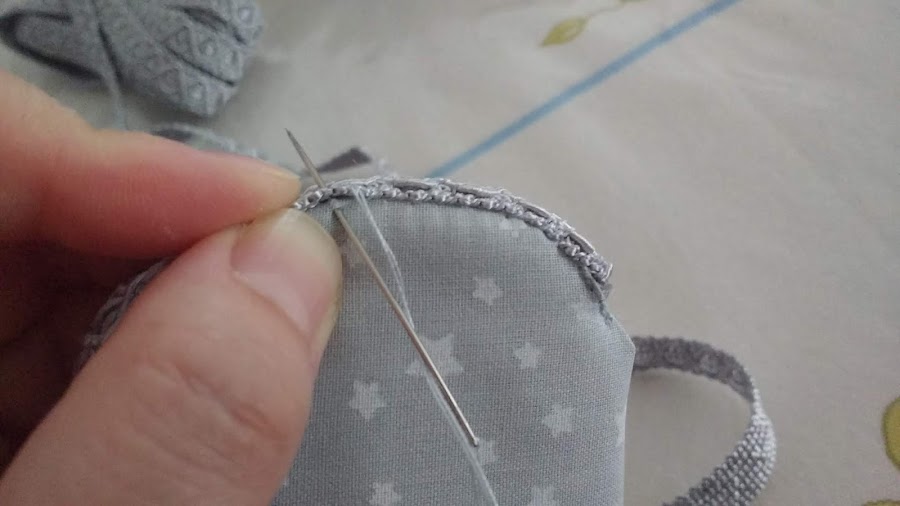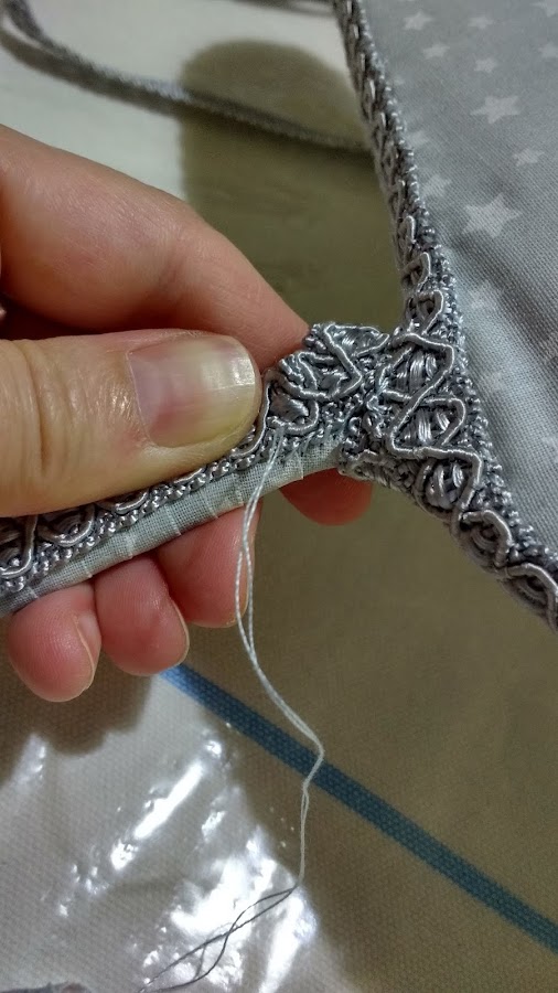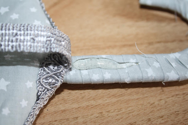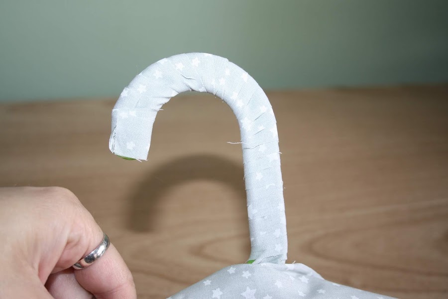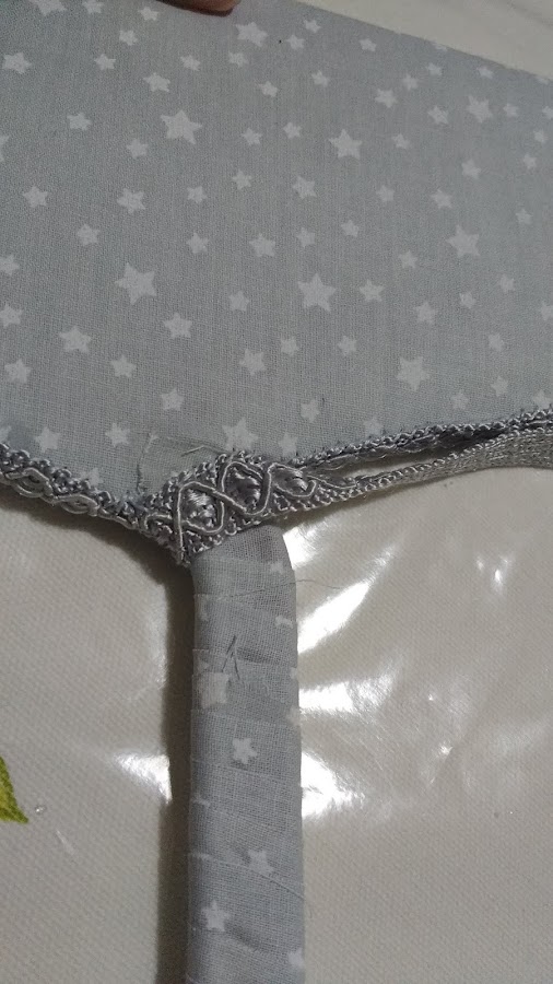 Por último, coseremos la cinta decorativa por todo el reborde de la percha.