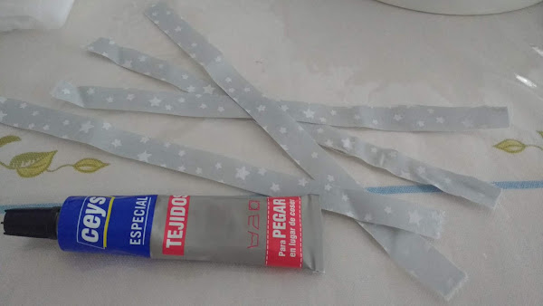 A continuación cortamos tiras de tela de algodón para ir tapando la parte de la percha que nos falta. Lo haremos con pegamento de tela.