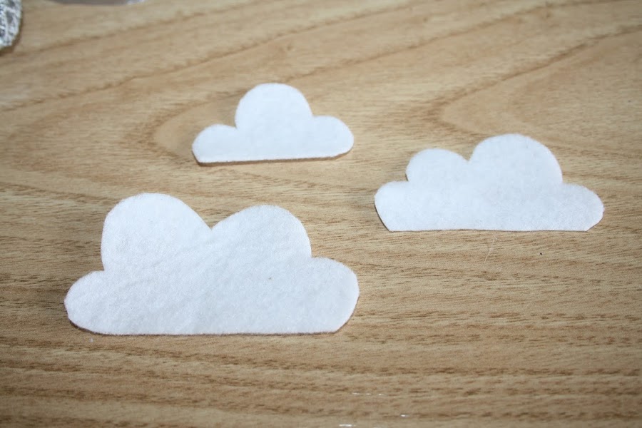 Y ahora podéis decorarlas con figuras de fieltro con unas nubecitas, estrellas, nombre del bebé, un osito, o lo que se os ocurra. También las pegaremos con silicona.