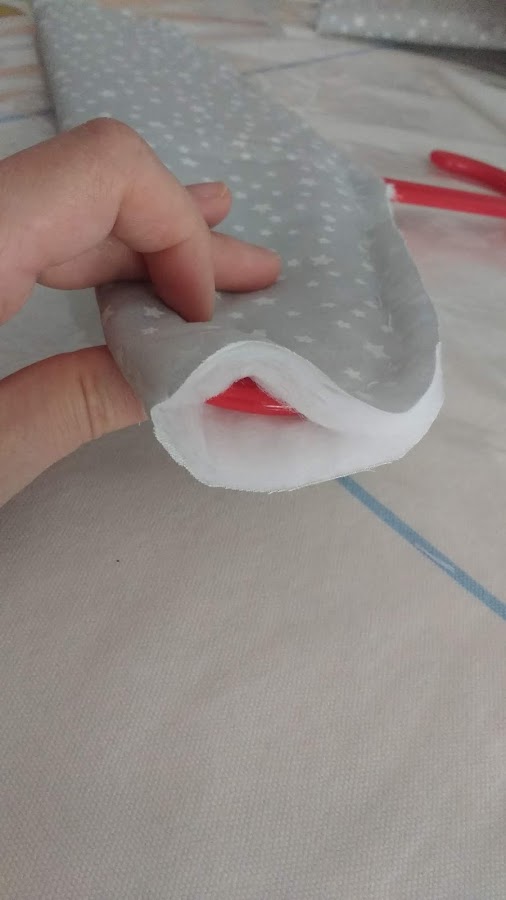 En este paso doblamos la tela sobre la que ya tenemos pegada a la percha, así evitamos arrugas y nos quedará lo mas bonita posible.