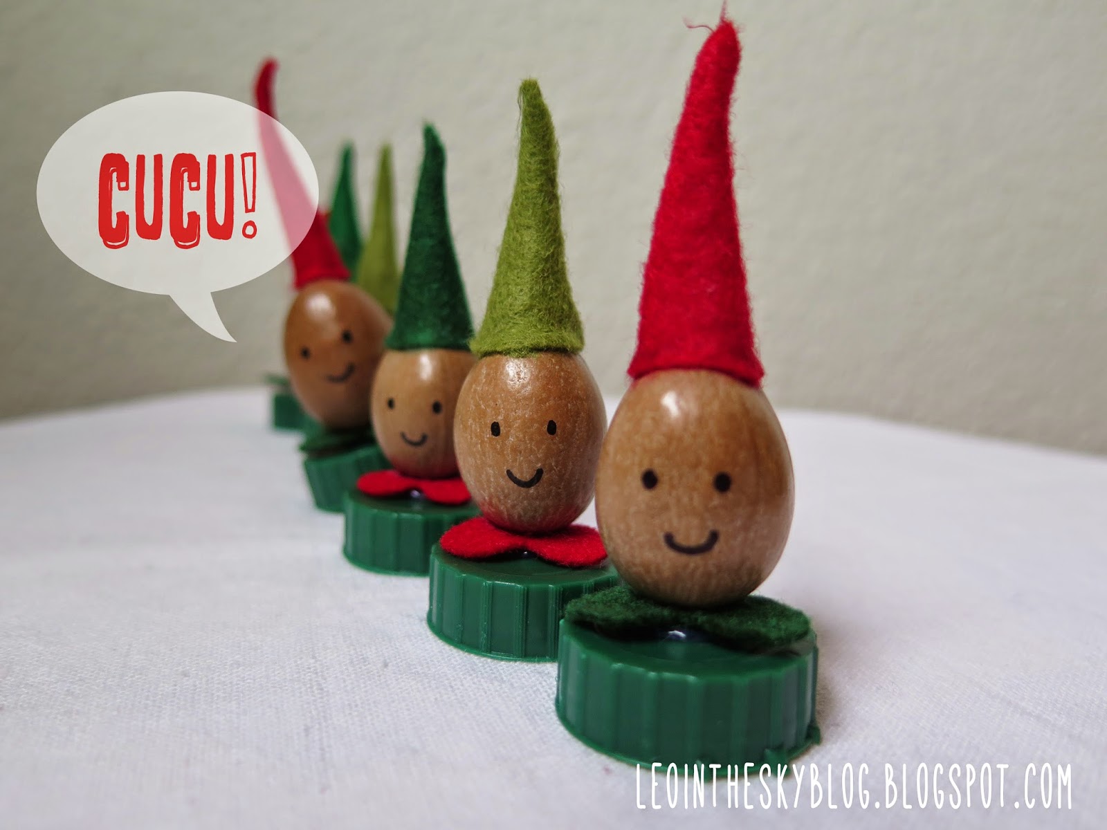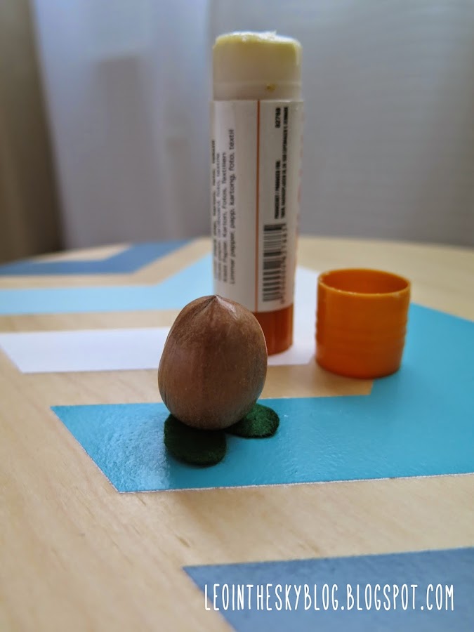 Pegar el gorro a la nuez y pintar los ojos y la boca con el rotulador permanente.