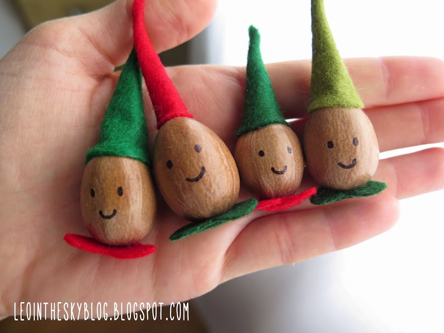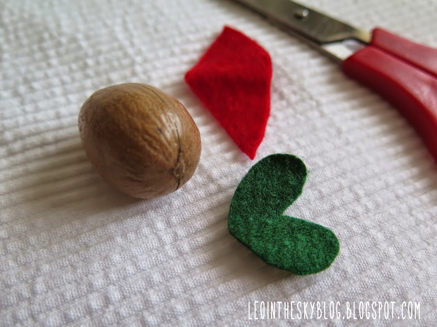 Los materiales: Nueces pecanas (con cáscara, claro) que se habían caducado hacía años (sí años, no estoy exagerando) y que guardaba por si me servían para decorar, fieltro, tijeras, pegamento en barra y rotulador permanente.