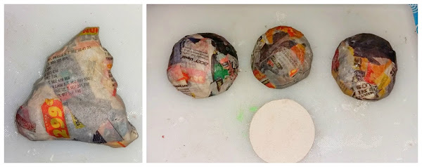 Si no tienes bolas de porexpan puedes hacer las bolas tu mism@ y para ellos solo tienes que recortar un molde de la figura que quieres y cubrirlas con papel bien apretadito e irle dando la forma con la cinta de carrocero.