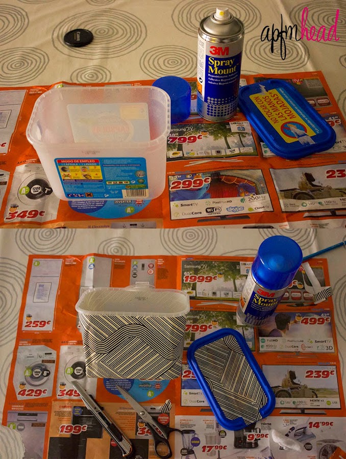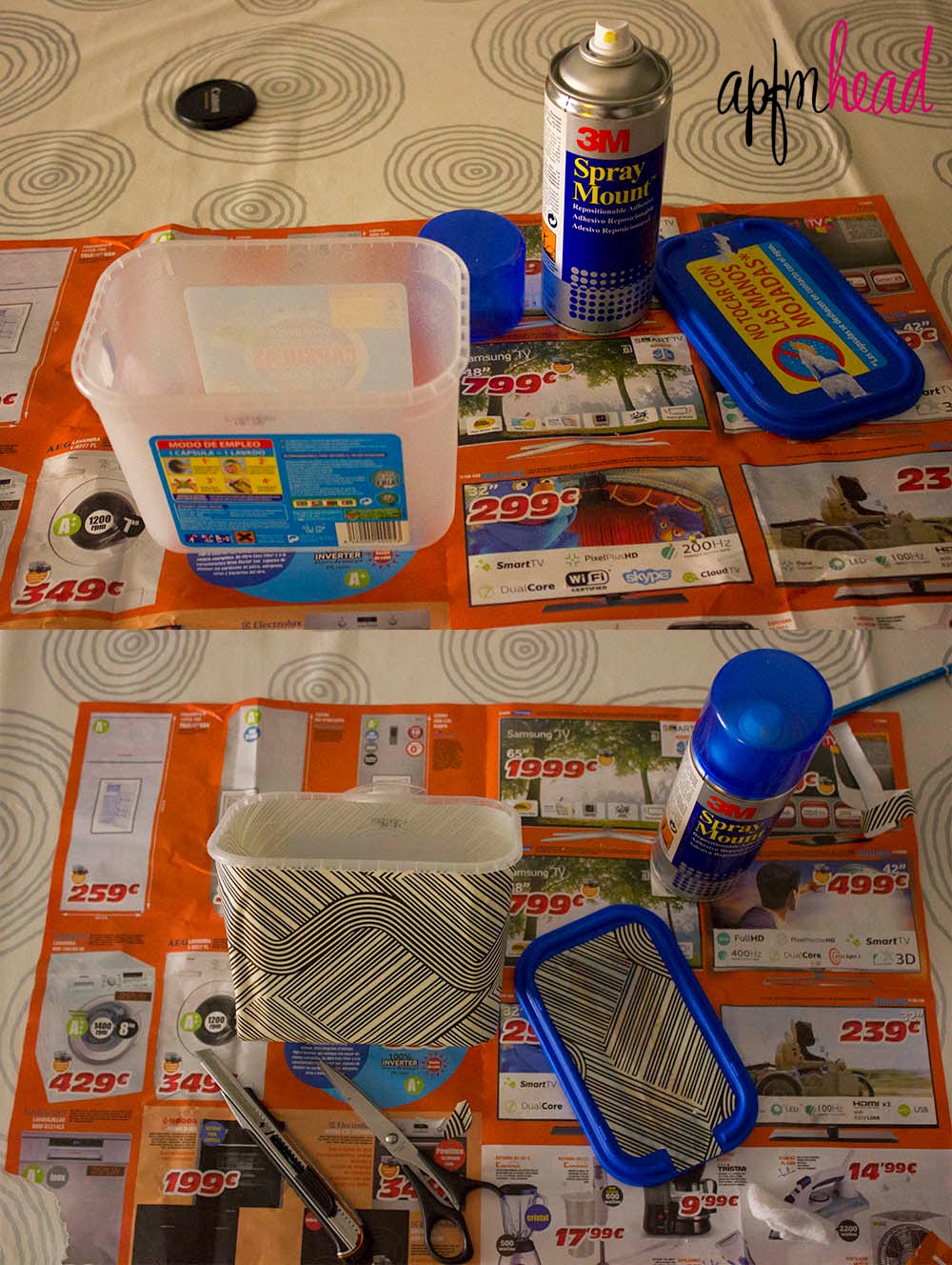 Lo primero que hacemos es limpiar la caja, un consejo para quitarle las pegatinas es dejar la caja a remojo un rato,que esté totalmente cubierta de agua la zona de las pegatinas, y si es agua caliente será mas rápido. Tomamos medidas y cortamos el papel, lo rociamos con el pegamento en spray y pegamos poco a poco intentando que no queden bolsas de aire. Lo bueno de este pegamento es que nos permite despegar y volver a pegar antes de que seque del todo. Para al tapa le hice una plantilla y un cartelito.