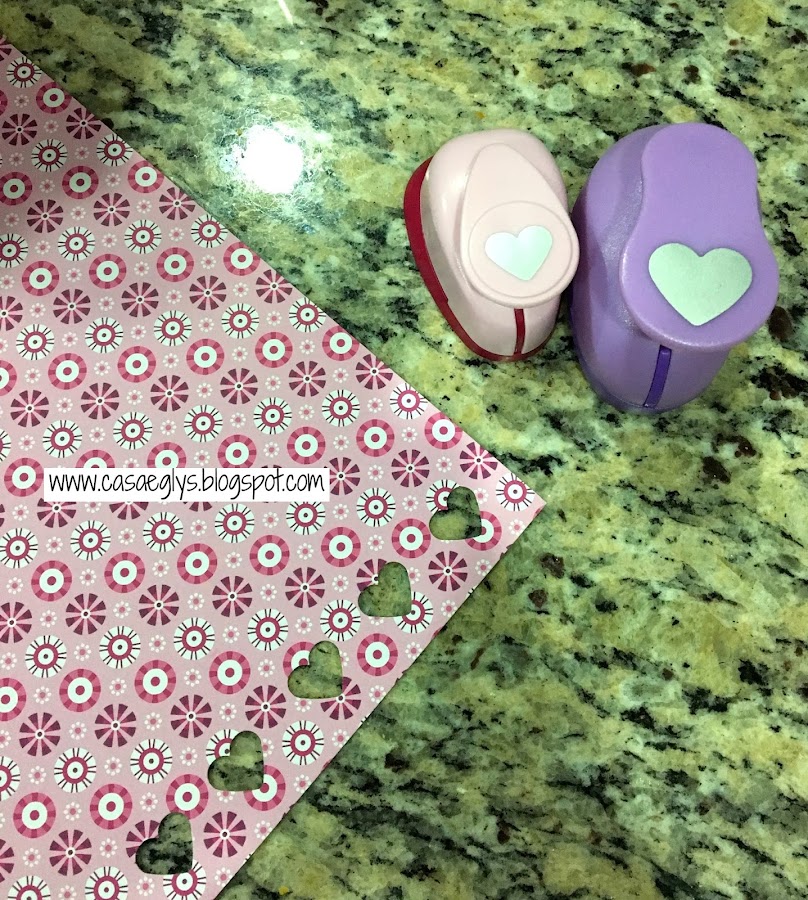 También me dio la idea de troquelar unos corazones para pegarle por los lados para que estuviese a tono con el papel frontal. Este mismo papel lo usamos para forrar dos pinzas de madera que van a sostener la caja en la nevera.