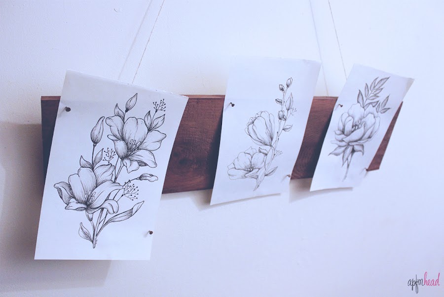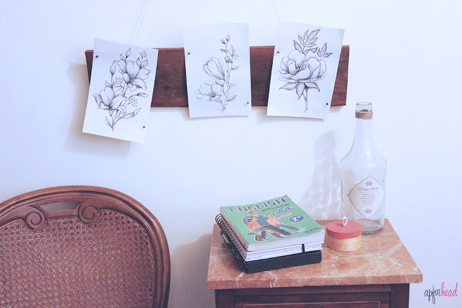 Simplemente con una tabla de madera vamos a poder colgar nuestras láminas favoritas. La tabla la hemos barnizado con un barniz con tinte para oscurecerla un poquito. Un par de alcayatas detrás para poder colgarla en la pared y con unos clavitos ( reutilizados del tapizado de una silla) hemos clavado nuestras láminas favoritas.