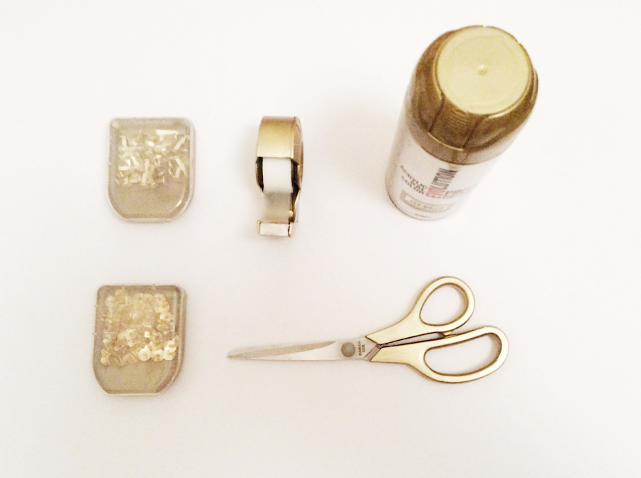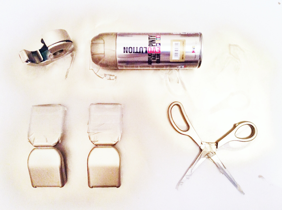 Los materiales necesarios son: pintura en spray dorada, celo y todas aquellas cosas a las que quieras darle ese toque de oro. En mi caso, he usado el portacelo, las tijeras y las cajas de chinchetas y clips.