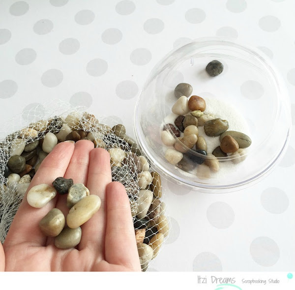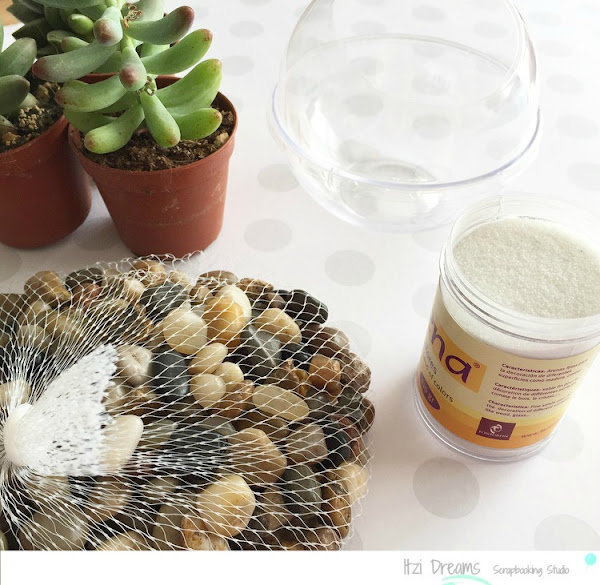 Empezaremos poniendo tierra blanca o del color que mas os guste, en el fondo. Encima con cuidado pondremos un poco mas de arena para trasplantar el cactus. Por último ponemos piedras para decorar y ya tenemos nuestras esferas listas.