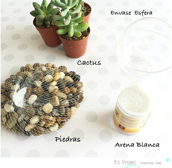 El Material que usaremos lo podéis encontrar en cualquier tienda de jardinería: Arena de color blanco, Cactus y piedras. Los recipientes son de los helados de una Fast Food.