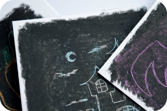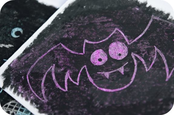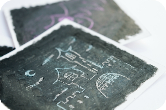 Hoy voy a enseñarte el DIY para hacerte unas tarjetas para halloween usando la técnica del esgrafiado, que no es ni mas ni menos que dibujar con un palillo encima de un papel que hemos preparado antes con colores y cera negra.