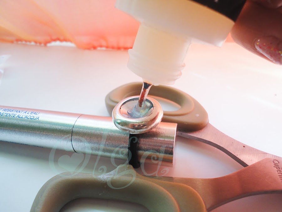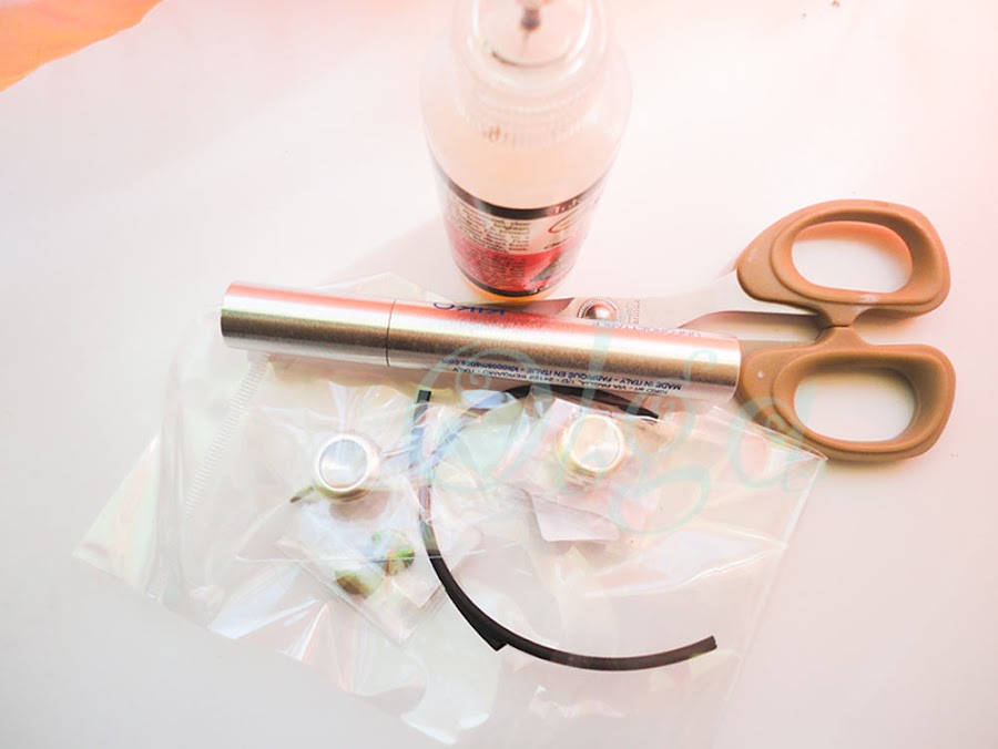 Necesitarás, además de lo incluído en el pack, una tijeras, un pegamento fuerte y algo con la medida del anillo, en este caso yo estoy usando un tubo de máscara de pestañas.