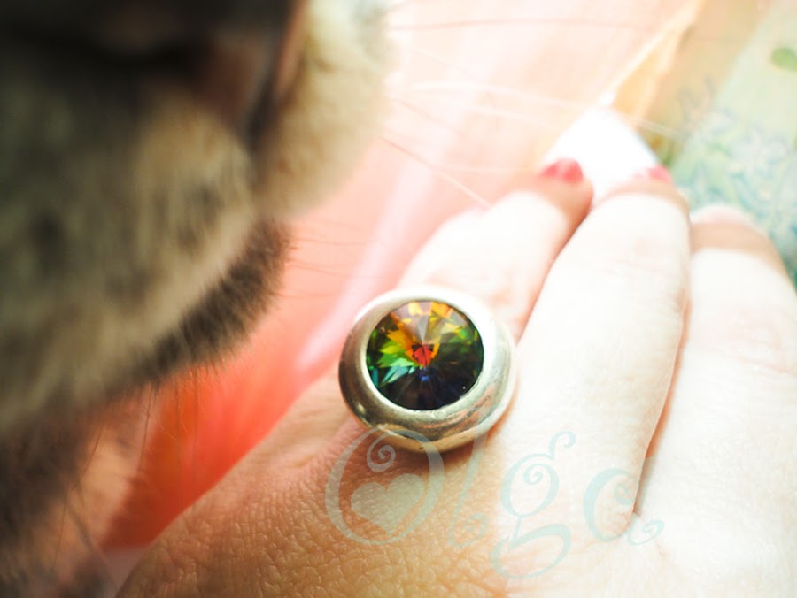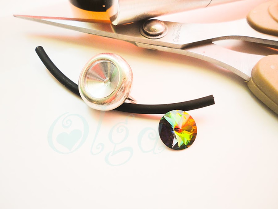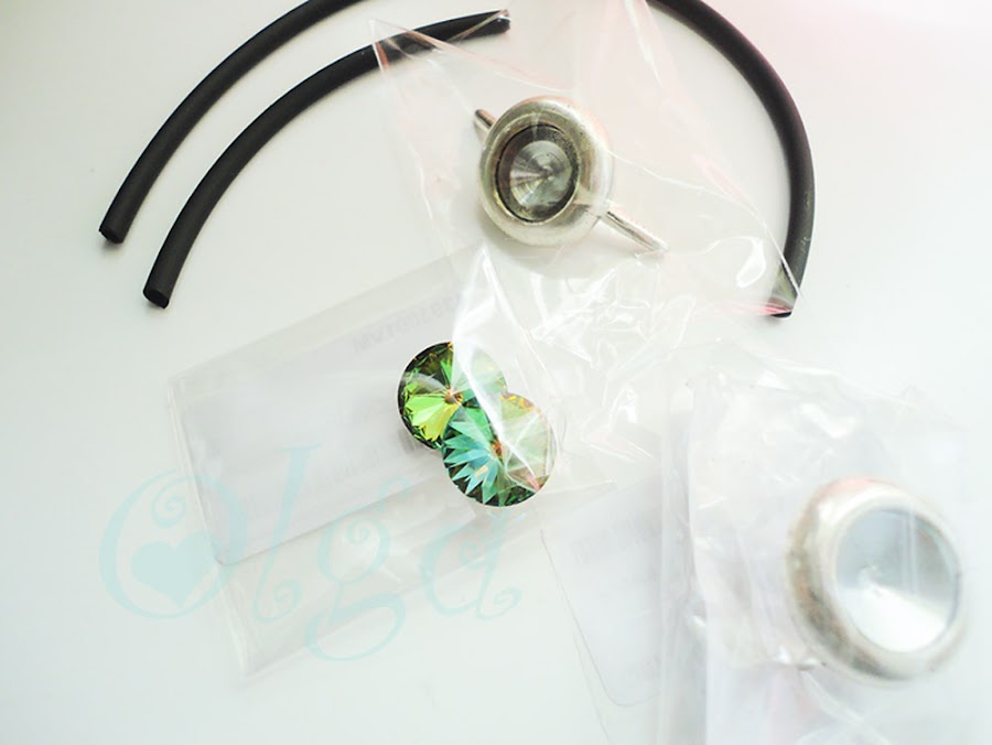 El kit lleva todo lo necesario para hacer un anillo y una pulsera a juego. Dos entrepiezas Zamak , una preparada para la forma de la pulsera y la otra para hacer un anillo, caucho precortado , y dos cristales rívoli Swarovski que en este caso son el tono Vitral Medium. Con un corte brillante que hace que el color cambie según la luz. Todo lo puedes ver aqui.