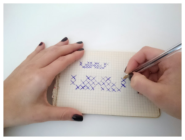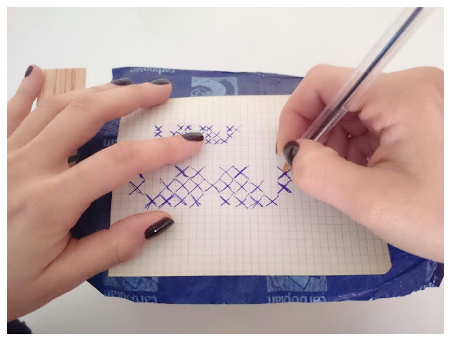 Primero el papel de calca con la parte que tiene la tinta hacia abajo, que esté en contacto con la madera, encima de ésta se colocará la gráfica de cruces, así ya lo tendremos dispuesto, sujetaremos para que no se nos mueva y calcaremos el dibujo.