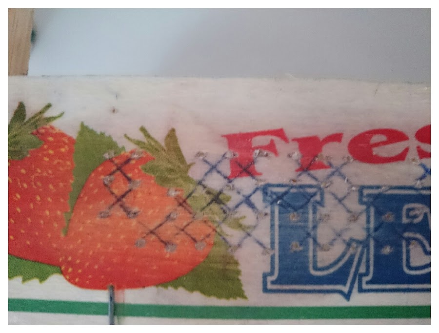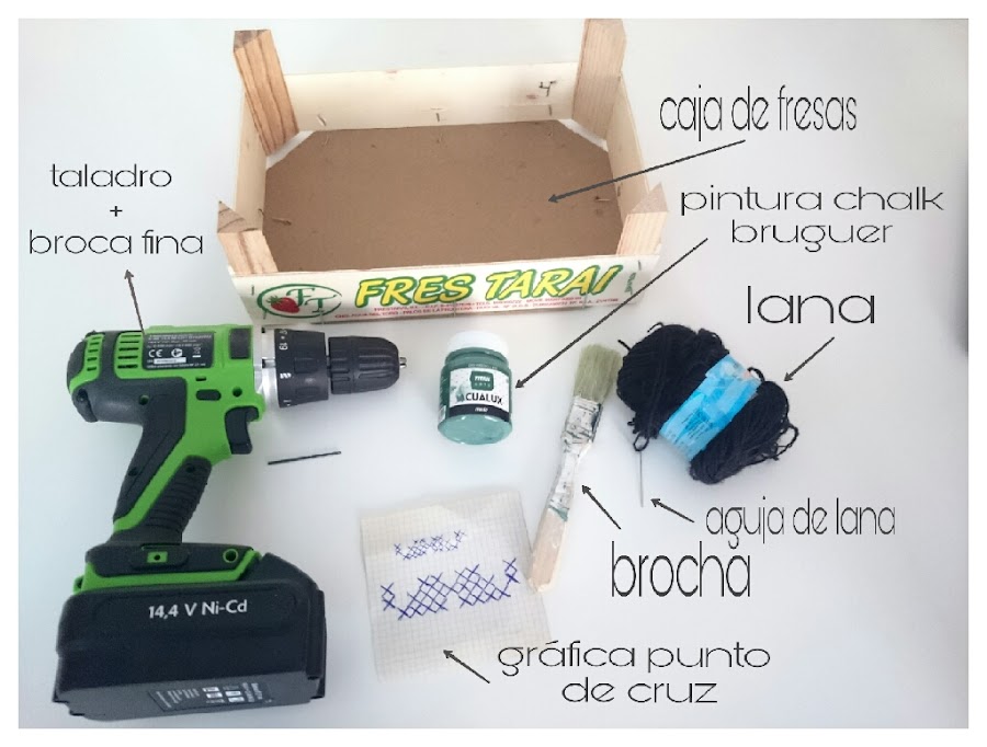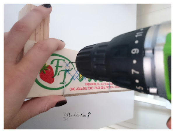 TRU-CONSEJO: Colocar un taquito de madera debajo del panel de madera, para evitar que al taladrar se nos astille el panel de la caja de fresas, ya que es bastante finito.