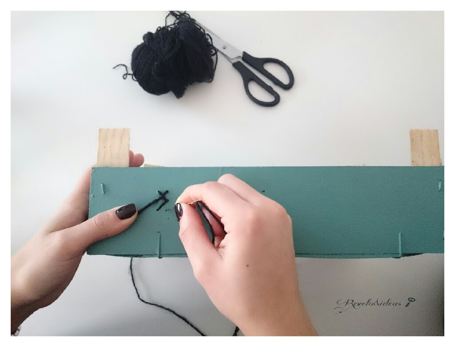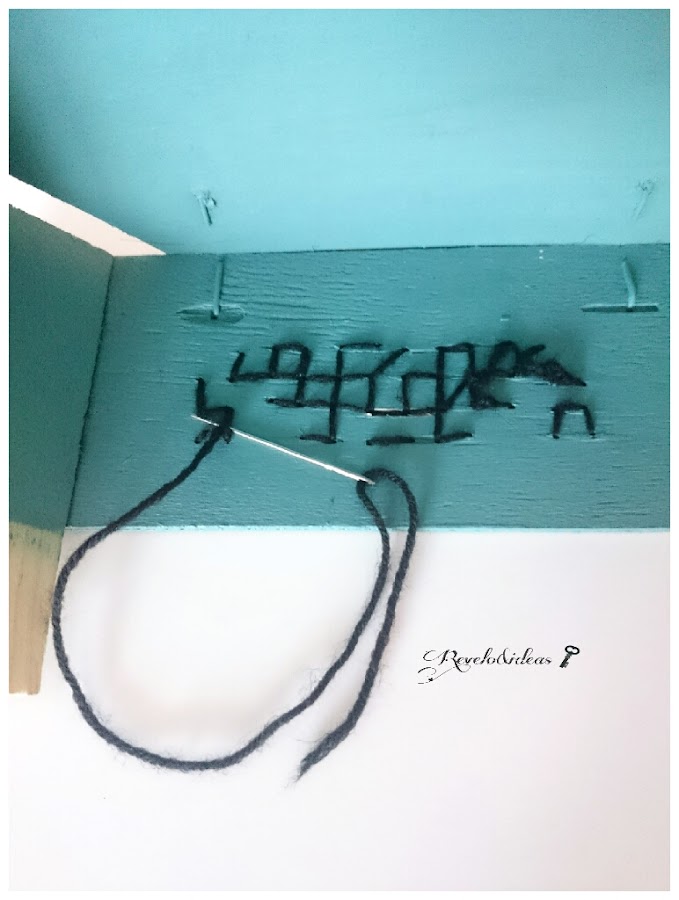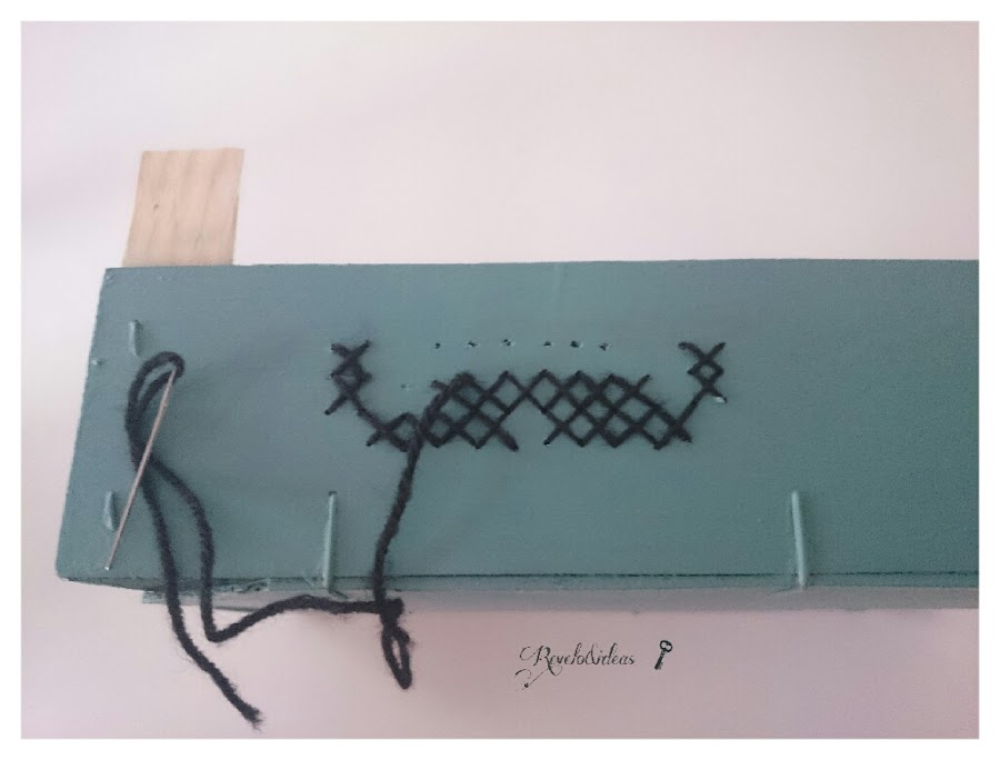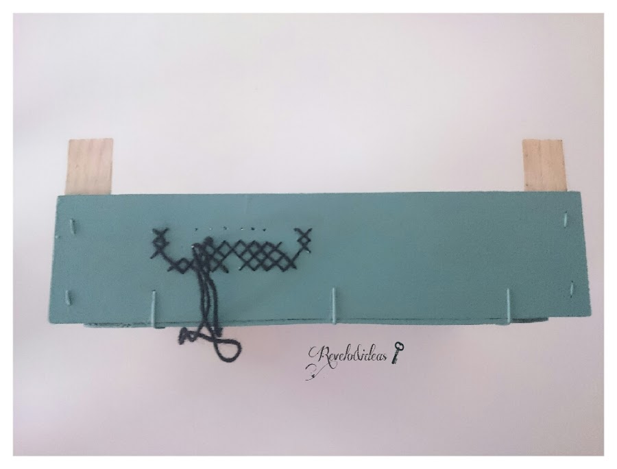 El siguiente paso es hacer el punto de cruz, que como su propio nombre indica, se trata de ir haciendo cruces, enhebraremos la aguja con la lana e iremos pasando por los agujeritos que hicimos con el taladro, desde arriba para abajo y desde abajo por arriba , como se ve en la imagen, es una técnica facilita, siempre tenemos que tener en cuenta que nos queden siempre cruces en la parte exterior de la caja.