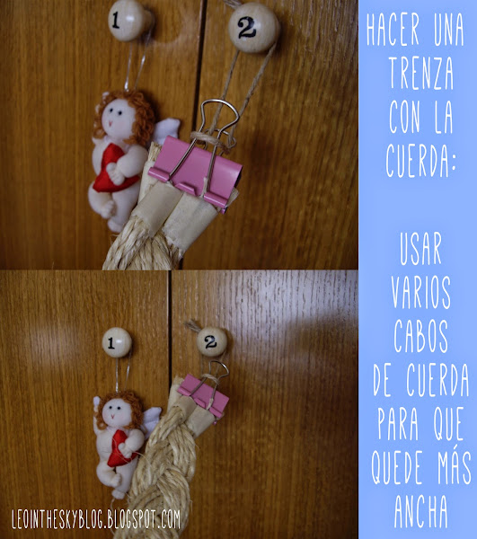 Después hice una trenza de cuerda usando seis trozos de cuerda en cada cabo. Un consejo: para hacer la trenza con que la cuerda sea de una longitud como 1,5 veces el perímetro del espejo es más que suficiente. Os lo digo porque yo siempre me paso tres pueblos, me da miedo quedarme corta y siempre acabo con una trenza inmensa..., vamos que me puedo hacer otro espejo cuando quiera que ya tengo la trenza hecha... :P