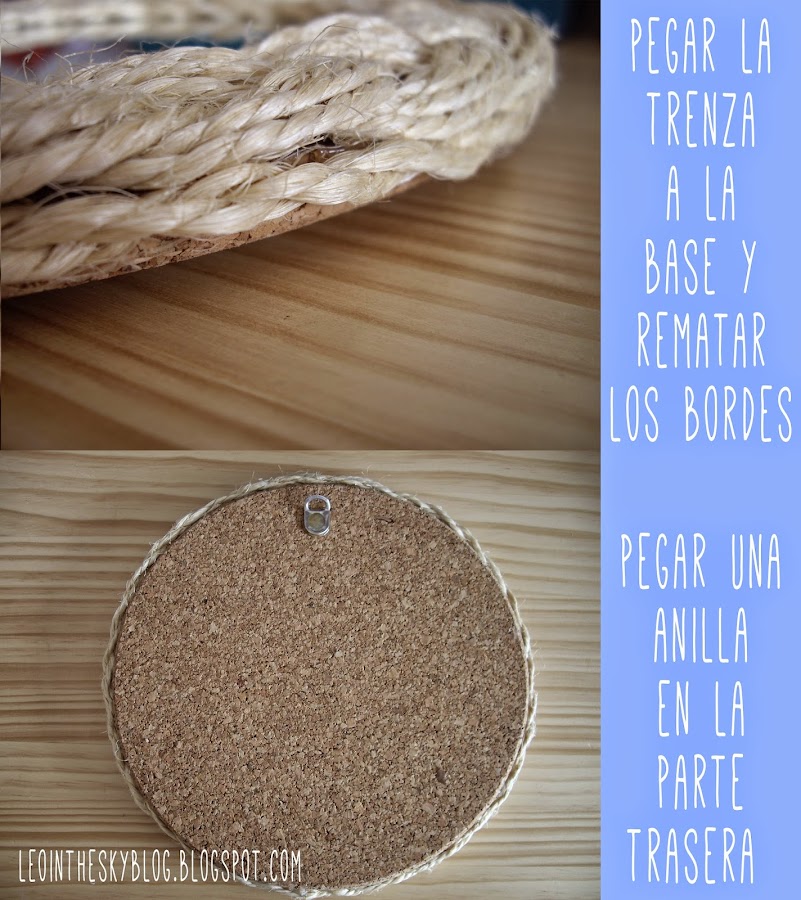 Después el problema era qué utilizar como base del espejo, al principio pensé en cortar un círculo de DM, pero la verdad es que me pareció un engorro, otra opción era usar cartón, pero me parecía que no iba a aguantar bien el peso.., hasta que se me ocurrió usar un salvamantel de corcho que encontré en uno de mis "chinos de cabecera" (un bazar cercano a casa en el que tienen casi casi de todo...¡me encanta! me van a hacer clienta honoraria cualquier día me temo...)