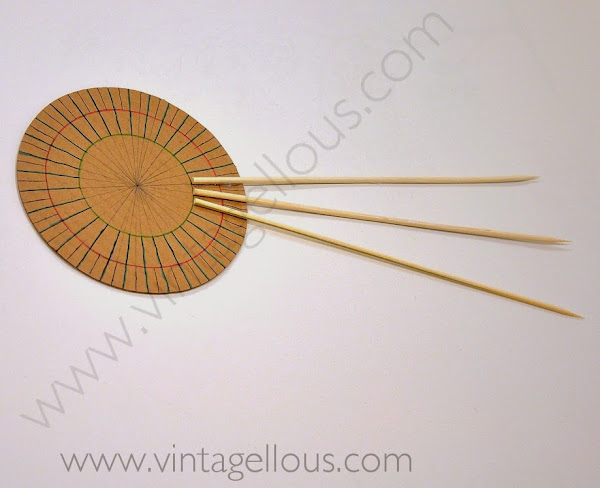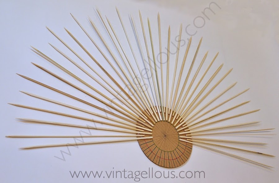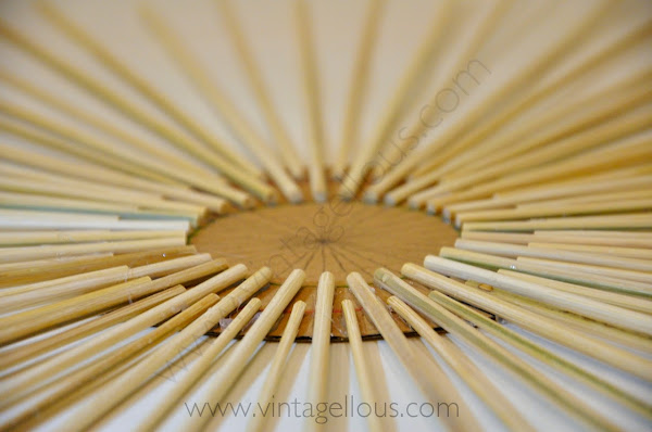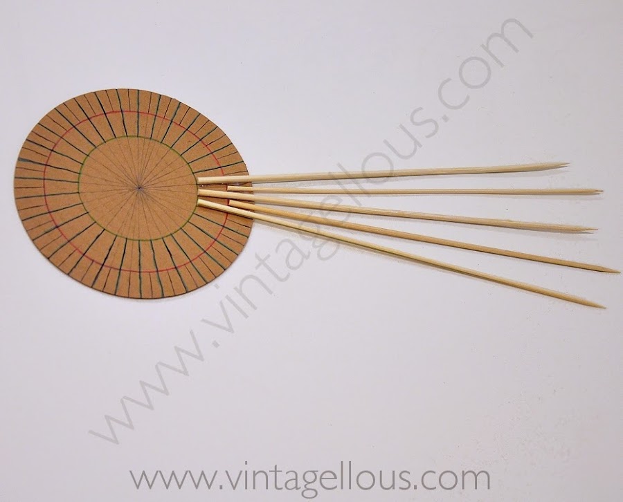 Y comenzamos a pegar los palos de madera con la pistola de silicona sobre las marcas que hemos realizado en el circulo de cartón, alternando al pegar un palo en la señal hasta el circulo pequeño (verde) y el siguiente palo hasta el circulo mayor (rojo), así conseguiremos que vayan alternando la altura los palos.