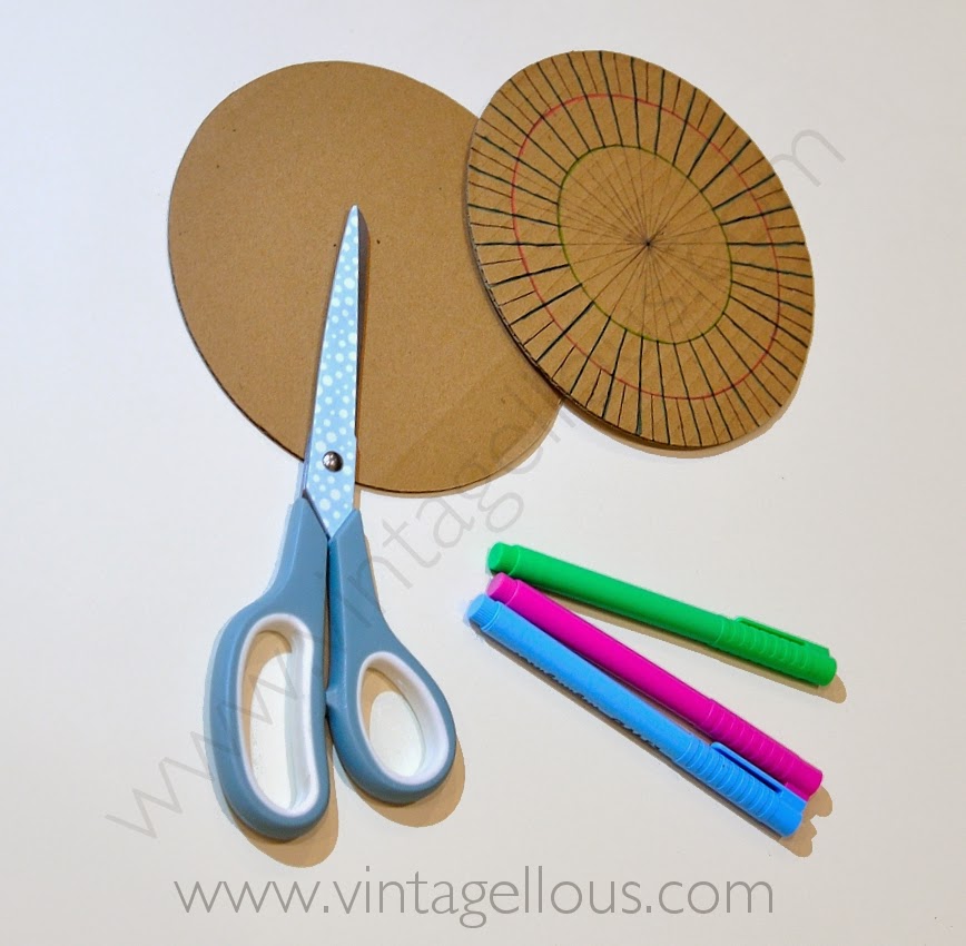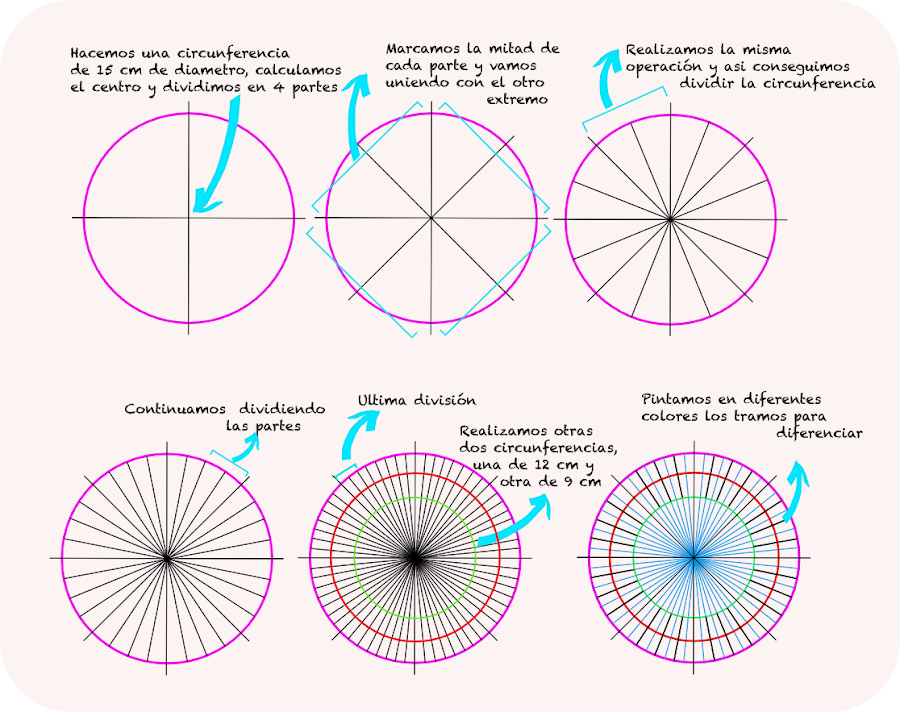 Lo primero será cortar un circulo de cartón con la medida que elijamos, nosotros lo hicimos de 15 cm de diámetro. Al circulo habrá que señalarle las divisiones como indicamos en el dibujo.