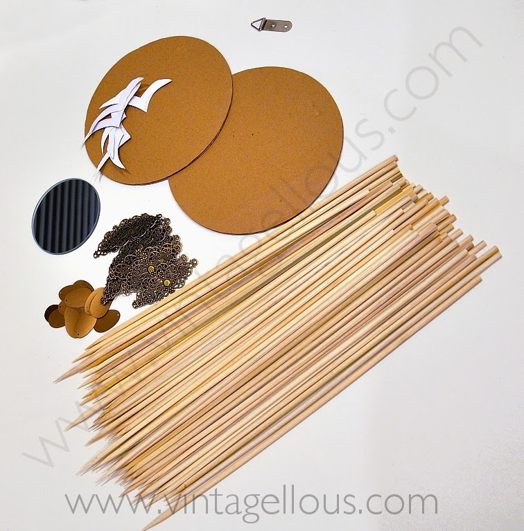 Necesitaremos 1 espejo, cartón, 64 palos de madera de los típicos para brochetas, pistola de silicona, cartulina, pegamento tipo súper glue, 1 colgador para cuadros, pintura tipo chalk paint, gesso o imprimación en gris oscuro, pintura dorada y abalorios de bisutería (bases de broches de filigrana).
