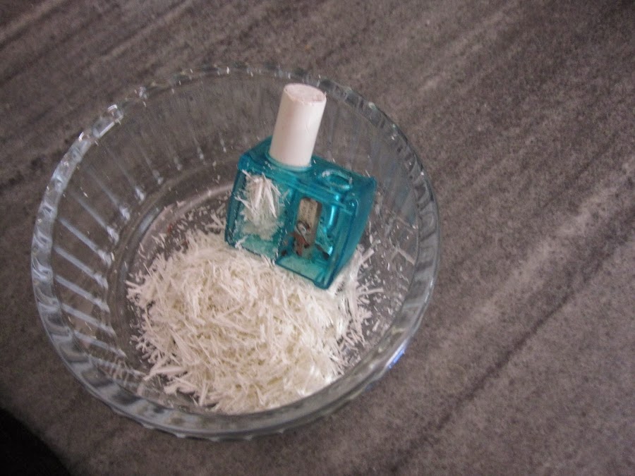 Luego saqué punta a las ceras que iba a usar, separando cada color en un recipiente. Mis ceras eran más gordas que las normales y el sacapuntas dejó unas virutas muy finitas. Depende del diseño, quizá quieras unas virutas pequeñas para conseguir más detalle o unas más grandes para dar textura.