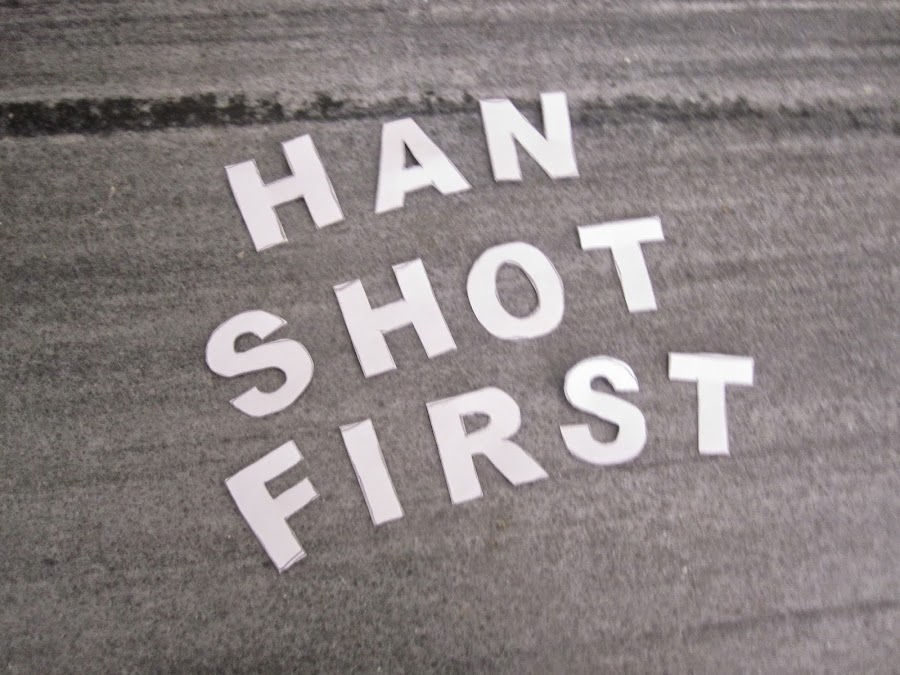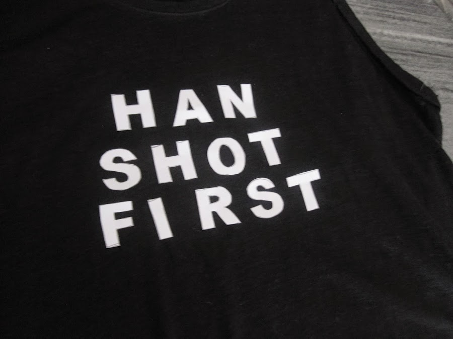 Lo primero que tienes que hacer es imprimir en un folio el diseño que quieres que tenga tu camiseta. Puedes ser cutre como yo (debo ser la única persona el siglo XIX que no tiene impresora) y calcar directamente el diseño de la pantalla de tu ordenador al folio. En este caso he usado una fuente de Picmonkey y la he ampliado hasta que tuviera el tamaño que yo quería. Para la otra camiseta usé la silueta de un solado imperial que encontré en Google. Para hacer el diseño que quieras te recomiendo buscarlo en inglés seguido de la palabra "stencil" (estarcido) y así te saldran diseños más fáciles de recortar.