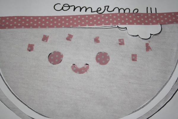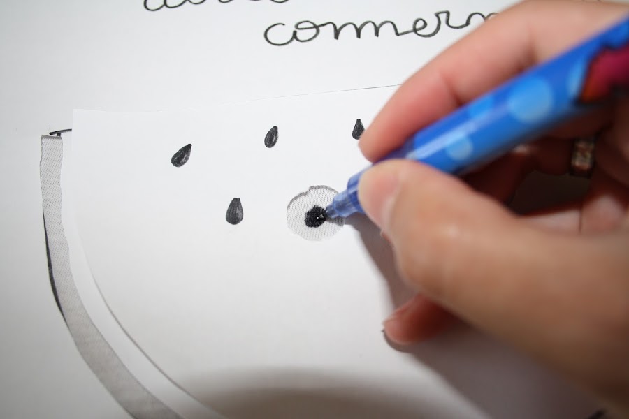 5/ Situaremos la plantilla donde queremos poner nuestro dibujo en nuestra camiseta y a continuación dibujamos los ojos, la boca y unas cuantas pepitas con el lápiz de tela.