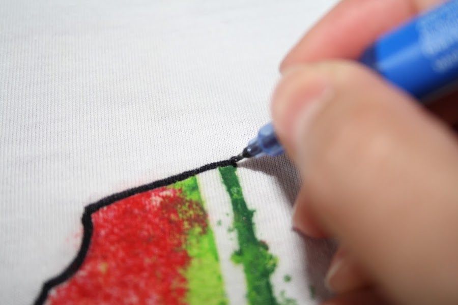 Después perfilé el contorno con el lápiz de tela para definir más el dibujo. También he sombreado la zona verde oscura para darle un poco más de profundidad.