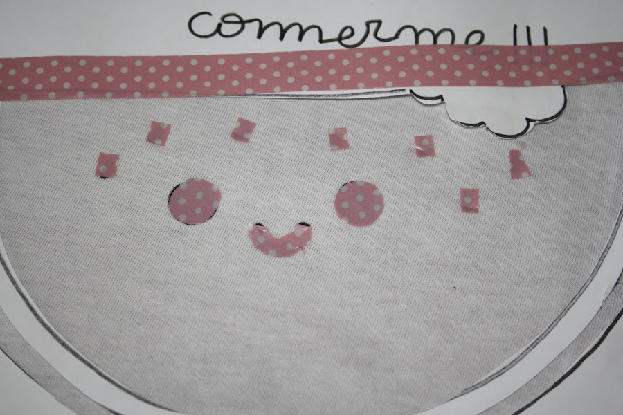 6/ Después pegamos la plantilla con cinta de whasi tape (que puede desprenderse fácilmente sin dejar marcas) y también taparemos los ojos, la boca y las pepitas.