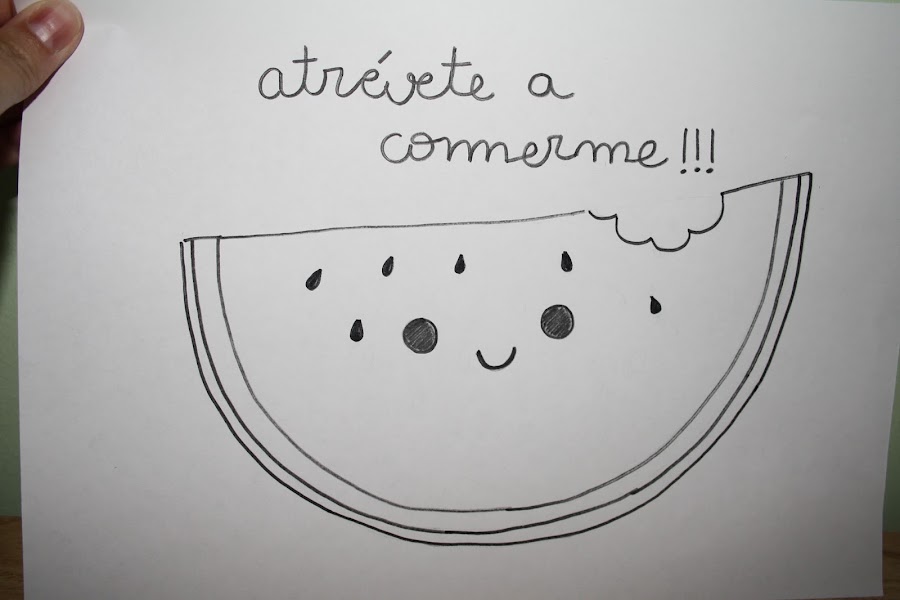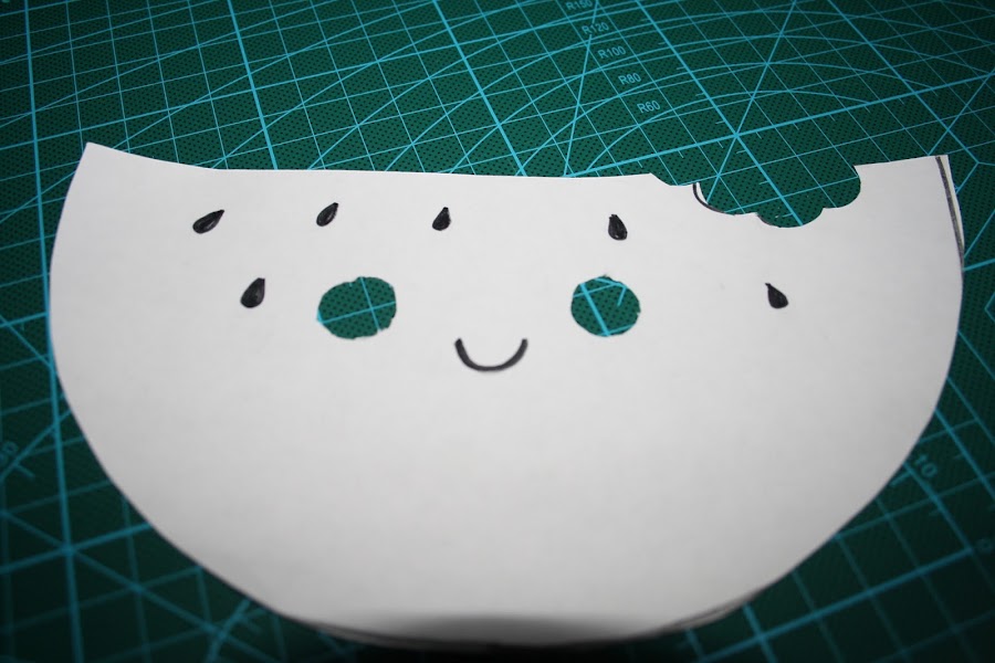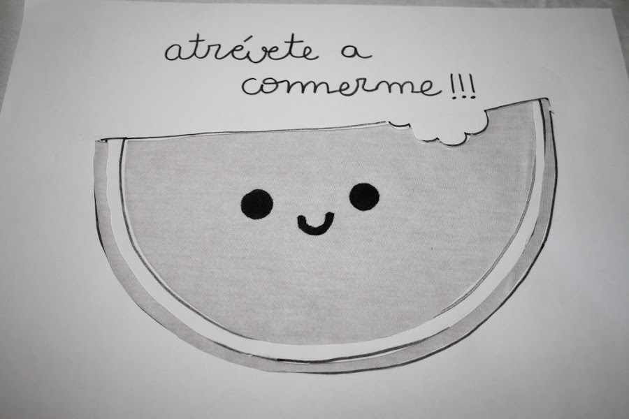 2/ Lo siguiente será hacer la plantilla y como aquí lo hacemos todo a mano, dibujamos una sandía con sus ojitos y boca y después cortamos la parte de dentro tal y como vemos en las fotos.
