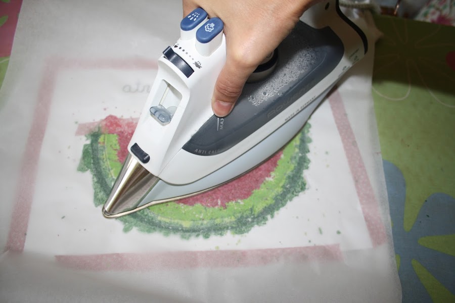 8/ Ponemos la lámina de horno encima de los colores y pasamos la plancha (sin vapor) un par de veces. Vamos a ver cómo la cera se van derritiendo y va estampando la camiseta.