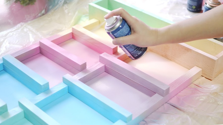 Ya sabéis que soy muy amante de dejar la madera al natural, pero en este caso, como la trasera es de cartón, he querido pintarlo todo para que no se aprecie la diferencia de material. Al principio iba a dejarlo todo de un mismo color, pero me vine arriba con mis pinturas en spray y al final hice un diseño en colores pastel degradados. ¿Se me ha ido mucho la mano, no?