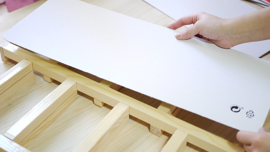 Cuando tengas montada la estantería por completo, aplica más cinta en la parte posterior de los listones, despega la capa protectora y pega el cartón para crear una trasera.