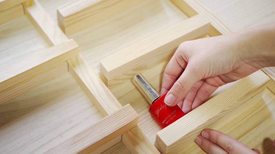 Por último, a mí me resultaba muy útil hacer un cajoncito en la parte inferior para guardar algunos utensilios como la lima, las tijeras, los discos de acetona, … Utiliza la cinta para montar este cajón y luego únelo a la estantería.