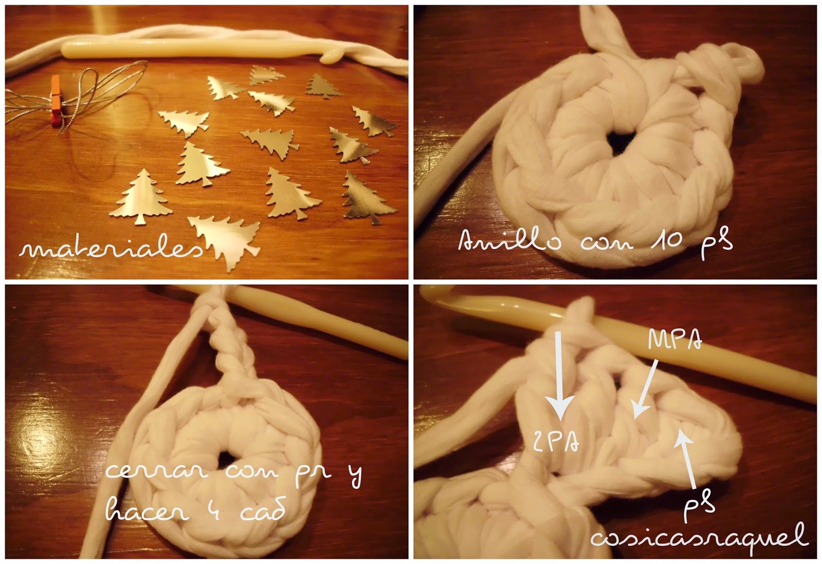 Ponemos un trozo de trapillo anudado para poder colgarla y pegamos el adorno del árbol en el centro.